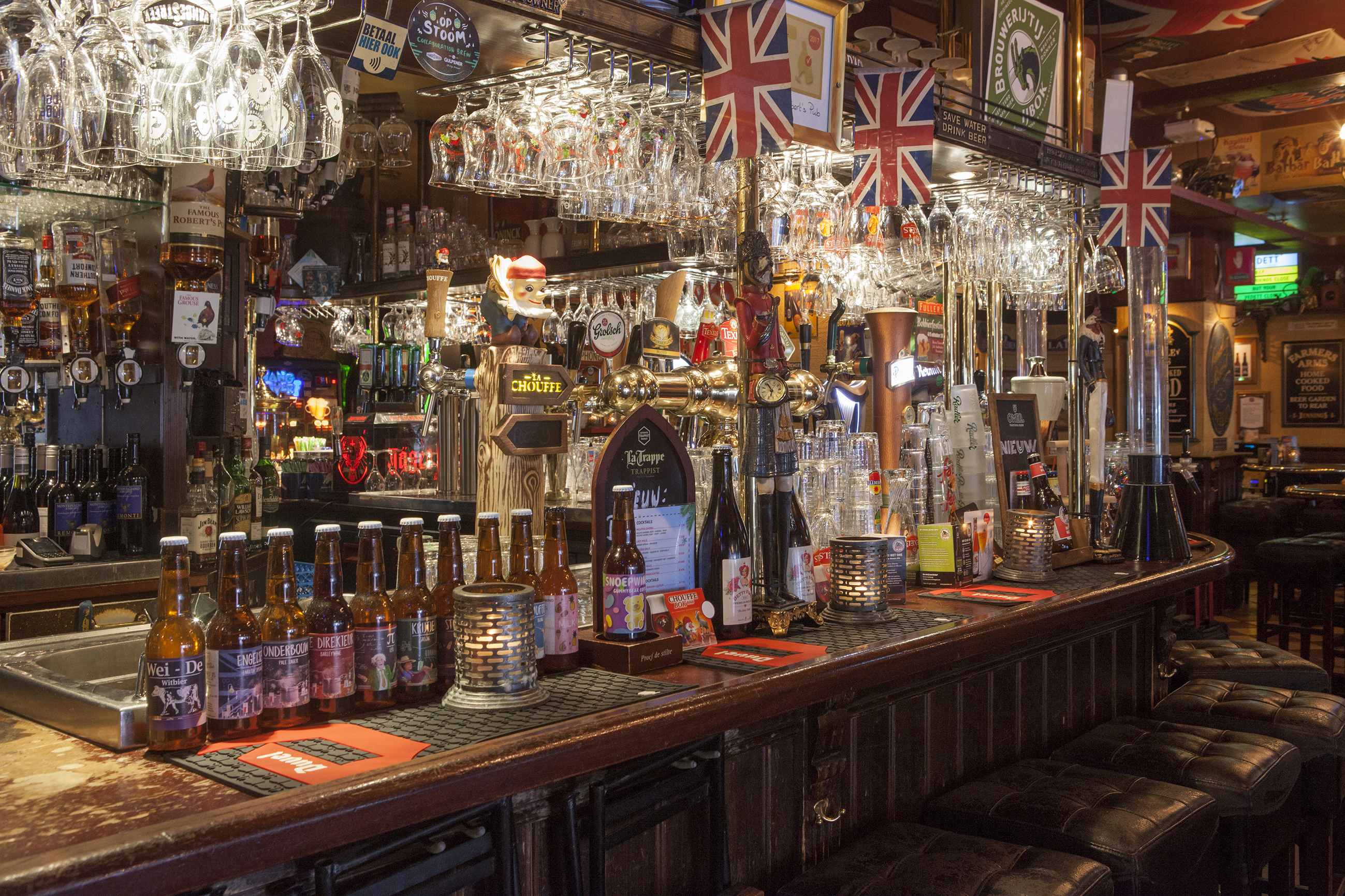 In Robert's Pub vind je de authenthieke Engelse eet- en drinkgewoonten: zoals Guinness, Kilkenny, een breed assortiment whisky's en natuurlijk het mandje chips.